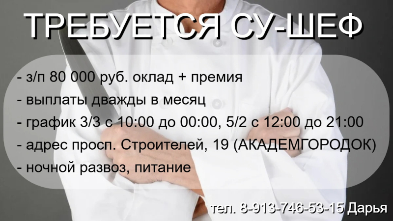 ТРЕБУЕТСЯ ПОВАР ГЦ, СУ-ШЕФ