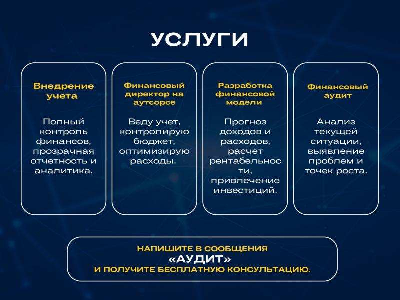 Результат: вы получите понятные отчеты (ДДС, ОПиУ), рост прибыли, оптимизацию расходов, финансовую модель и снижение операционной нагрузки. Вы сможете сосредоточиться на стратегии.