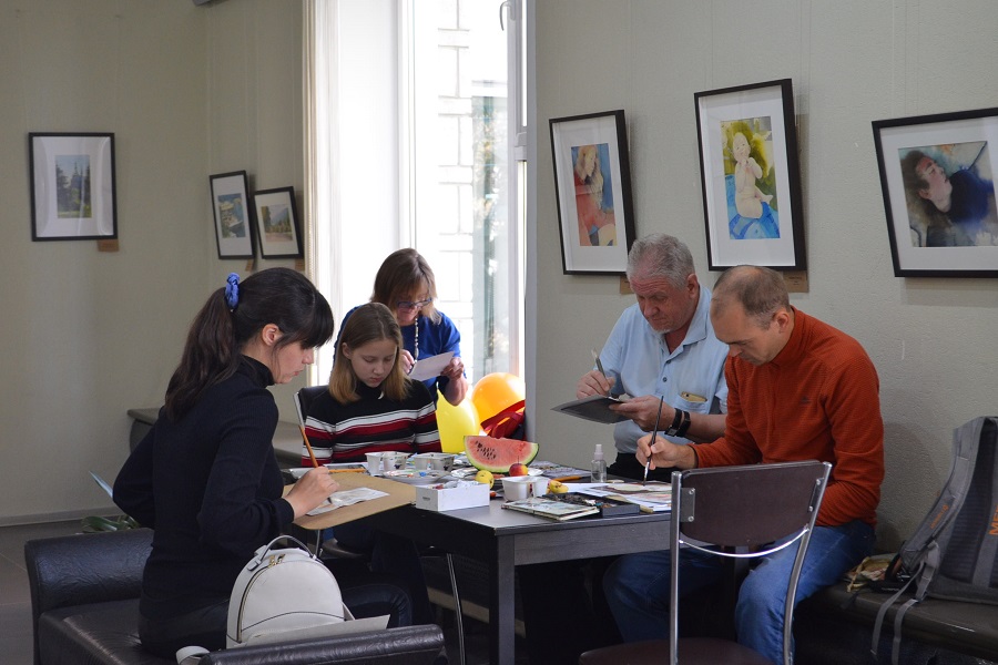В выставочном зале люди делятся на две группы: тех, кто внимательно рассматривает выставку, и тех, кто учится рисовать самостоятельно. На столах с красками, кистями, листами бумагами – еще и «модели» в виде дольки арбуза и яблок. Рисуют все: взрослые и дети, женщины и мужчины.