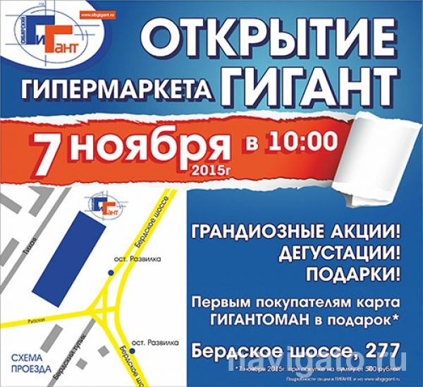На сайте холдинга «Сибирский Гигант» сообщается, что в день открытия гипермаркета гостей ждёт праздничная программа, грандиозные скидки более чем на 1000 товарных позиций и приятные сюрпризы. Всем, кто в этот день с 10 до 18 часов совершит покупку на сумму от 500 рублей, подарят карту «Гигантоман».