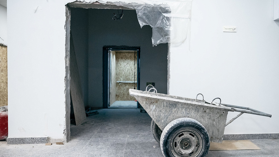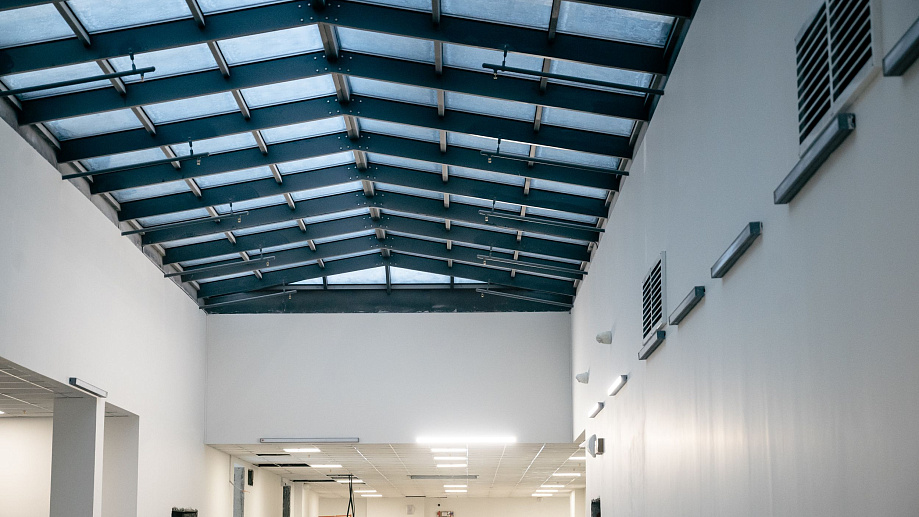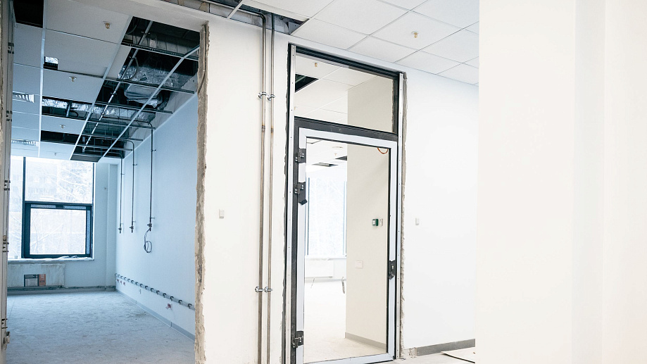 Сейчас ведётся монтаж противопожарных штор – это конструктивные элементы противопожарной безопасности, которые в случае возникновения пожара отсекают один этаж от других. Подобная система предусмотрена на 1-3-х этажах. Идёт чистовая отдела помещений: уже готовы потолки и стены, осуществляется монтаж электрики и розеток; начался монтаж дверей.
