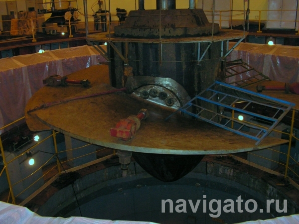 Демонтаж рабочего колеса гидроагрегата №6 провели 14 ноября. Начался он еще в 8 часов утра и к 10 часам, моменту появления журналистов, уже был извлечен из рабочей камеры и медленно поднимался на высоту мощными мостовыми кранами.