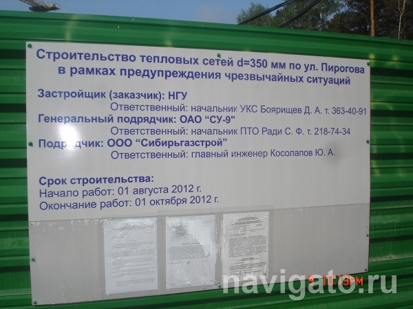 Как сообщили в пресс-службе НГУ, на улице Пирогова идет подготовка к строительству новой теплотрассы, которая обслуживает ЦКБ, студенческие общежития и жилые дома. Существующая сеть под проезжей частью, введенная в эксплуатацию более 50 лет назад, находится в ветхом состоянии и не обеспечит надежного теплоснабжения в следующем отопительном сезоне. Новая теплотрасса строится во исполнение решения комиссии по чрезвычайным ситуациям и обеспечению пожарной безопасности администрации Советского района в соответствии с техническими условиями на подключение к тепловым сетям строящегося главного корпуса НГУ. Техусловия выданы ГУП «УЭВ СО РАН».