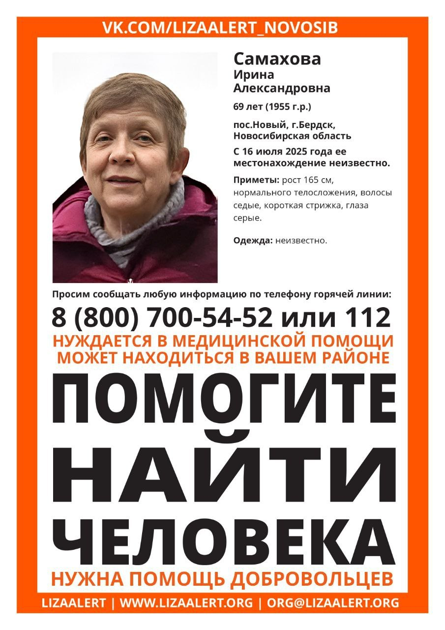 Сибирячка 16 июля ушла из дома в посёлке Новом, который территориально входит в город Бердск. Её местонахождение до сих пор не известно. Родные обратились за помощью в полицию и поисковый отряд «Лиза Алерт Новосибирск».