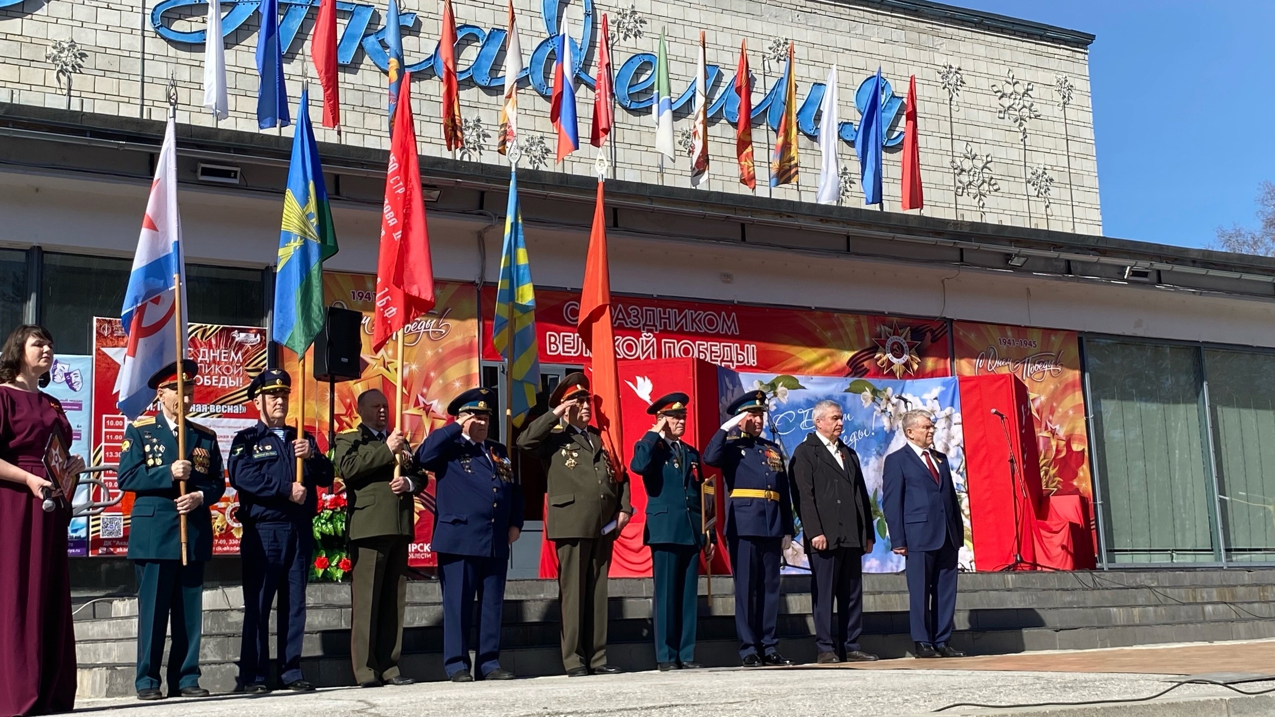 В День Победы на площадке перед ДК «Академия» состоялся торжественный митинг. Глава Советского района Дмитрий Оленников приветствовал собравшихся.