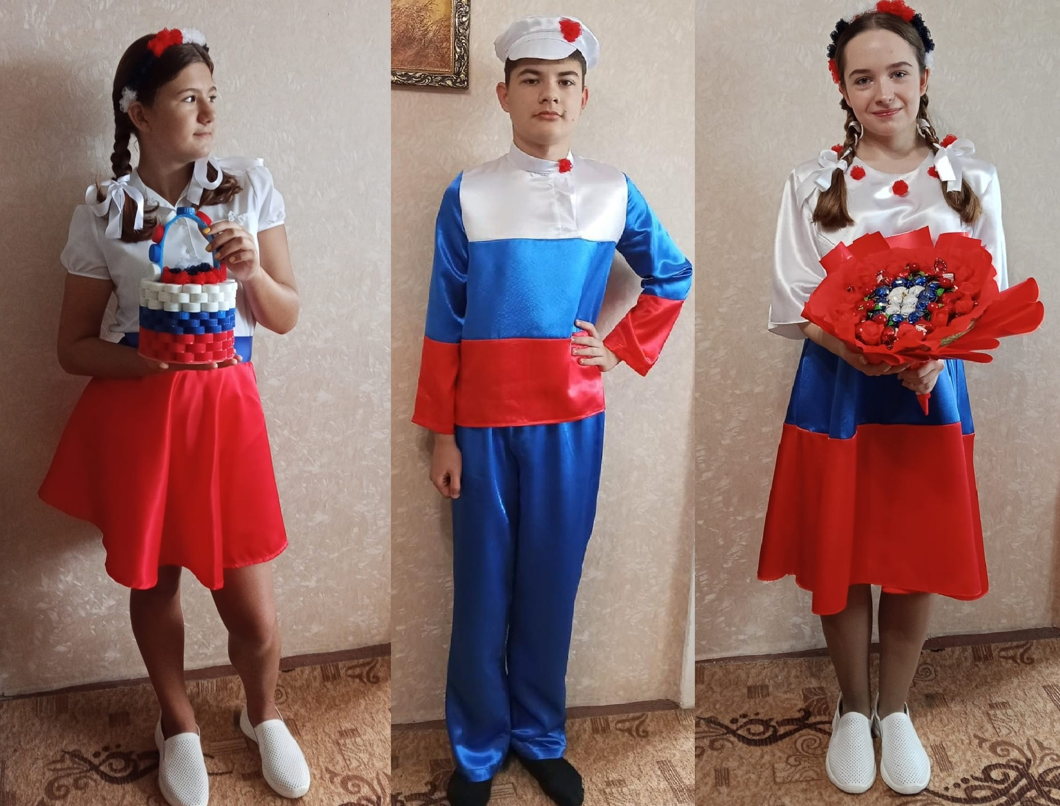 Свои работы они создали под руководством педагога Елены Коваленко. Ученица 6 «а» класса Валерия Виль представила «Корзинку с цветами», сделанную из крышечек, а ученица 9 «и» Анна Костылева сшила женский и мужской костюмы из креп-сатина, а также представила букет из конфет и цветной бумаги для подарка.