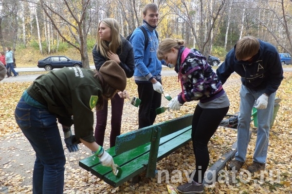 Главным делом второго дня трудового десанта, 10 октября, стал мелкий ремонт и покраска скамеек в сквере около памятника «Вальс Победы». К этой работе подключились и студенты НГУ.