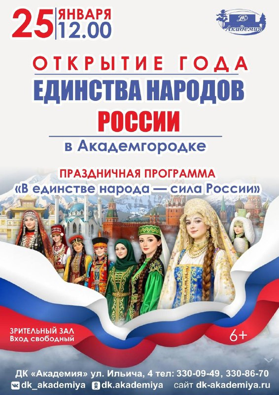 Праздничная программа «В единстве народа – сила России!» (0+) пройдёт в Доме культуры «Академия» в воскресенье 25 января.