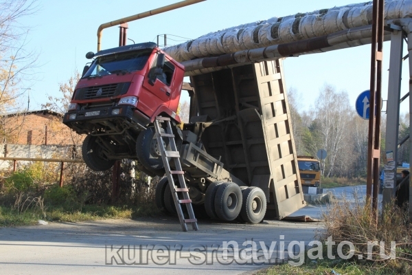 По неизвестной причине 13 октября водитель грузовика HOWO не смог разъехаться с трубопроводом – большегруз зацепился за него кузовом. Подробности курьезного происшествия пока неизвестны.