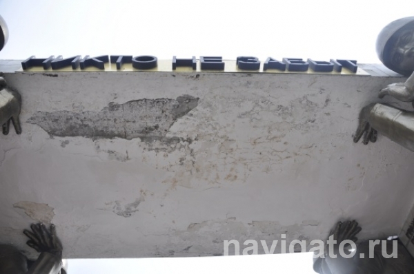 На стеле — дыра, отсутствует одна плитка. Когда дует ветер, воздух попадает в эту дыру и слышен жуткий вой. Над потухшим Вечным огнем сыпется арка, куски штукатурки лежат рядом с символом вечной памяти о погибших в годы войны.