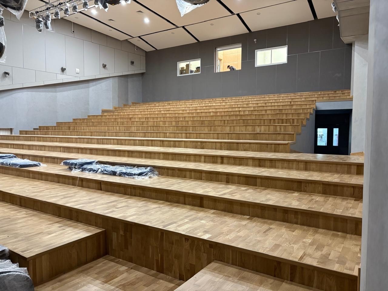 Сейчас строители работают в большом концертном зале. Как сообщили в департаменте строительства и архитектуры мэрии Новосибирска, в зрительном зале завершили отделку стен и потолка, выполнили работы по устройству сцены, приступили к установке кресел в концертном зале.