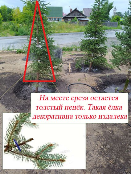 В композиции все ели были подстрижены в форме узких треугольников. Это часть уходовых процедур. Такую ель легко отличить от тех, которые продаются на ёлочных базарах, по коротко подстриженным толстым веточкам, из которых пучками растут молодые мягкие ветки.