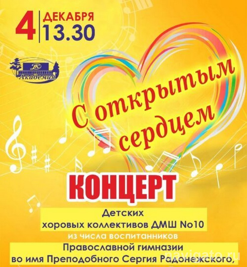1 декабря в ДК «Академия» (ул. Ильича, 4) музыкальное поздравление готовит симфонический оркестр Дома культуры. Начало в 19:00. 4 декабря в 13:30 там же пройдёт концерт «С открытым сердцем» – выступят солисты ансамблей ДМШ №10 из числа воспитанников Православной гимназии во имя преподобного Сергия Радонежского.