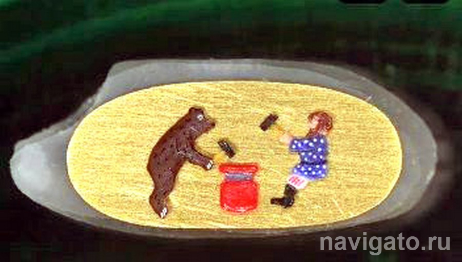 Мастер из Академгородка Владимир Анискин завершил работу над своей первой движущейся миниатюрой. Он разместил фигурки мужика и медведя на рисовом зёрнышке.