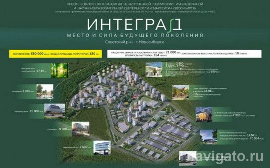 По словам генерального директора Агентства развития жилищного строительства Новосибирской области Ашота Рафаеляна, по проекту в микрорайоне предполагается строительство двух школ, трёх детских садов и поликлиники. Все объекты расположены в 5-8 минутах ходьбы от любого жилого дома. Для молодёжи в общественно-деловой зоне предусмотрен арт-квартал площадью 3350 кв. метров. Предполагается, что в микрорайоне будет проживать 21 тысяча человек. Общий объём государственных и частных инвестиций в строительство «Интеграда» до 2035 года составит более 150 млрд рублей.