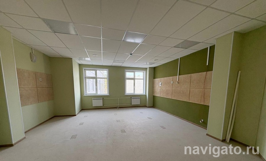 На втором и четвёртом этажах завершена отделка помещений, окраска, установлены внутренние двери. Ведутся работы в зрительном зале на 350 мест: выполнено устройство сцены, приступают к укладке паркета.