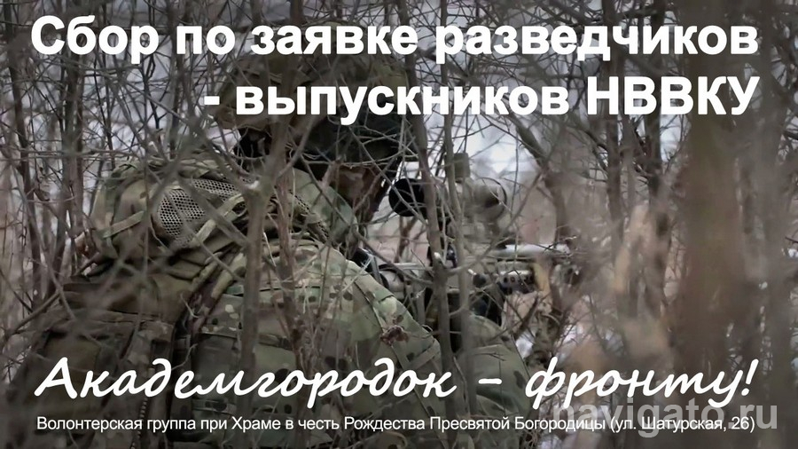 Принять участие в сборе: 8-913-731-1441, СБЕР, Наталья Викторовна А. (координатор сбора, руководитель волонтёрского движения «Академ-фронту»). Пометка в сообщении: «Помощь СВО – НВВКУ». По итогам отправки будет опубликован отчёт в «Навигаторе» и телеграм-канале @AkademFrontu.