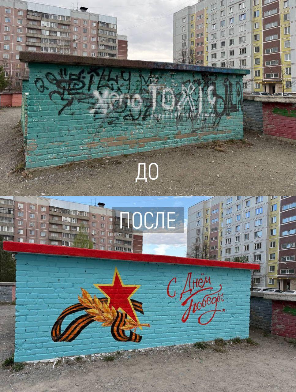 Совета дома обратился к Виктору Александровичу за помощью в реализации росписи с символикой праздника 9 Мая. На выделенные депутатом средства были приобретены материалы для работы. Графику выполнила местная талантливая художница Анастасия Латынцева.