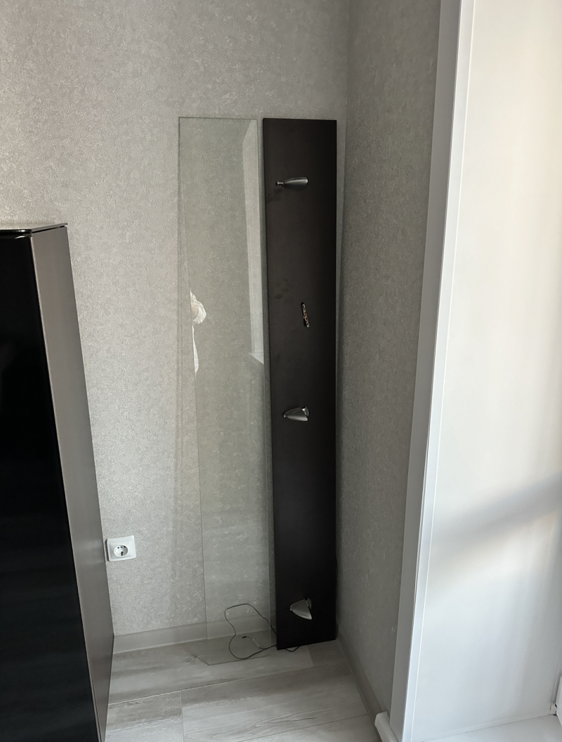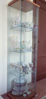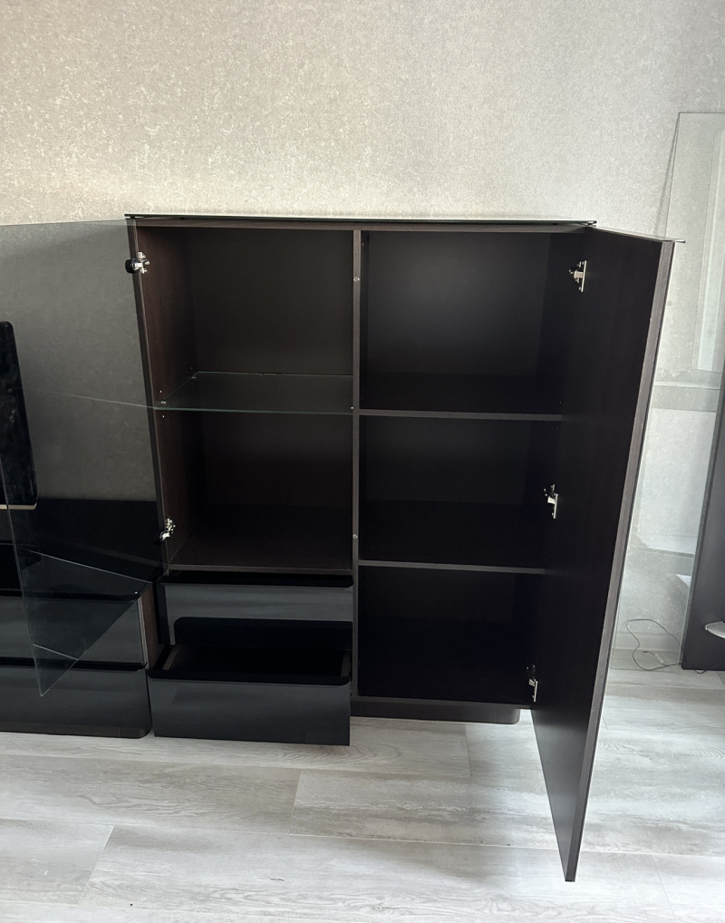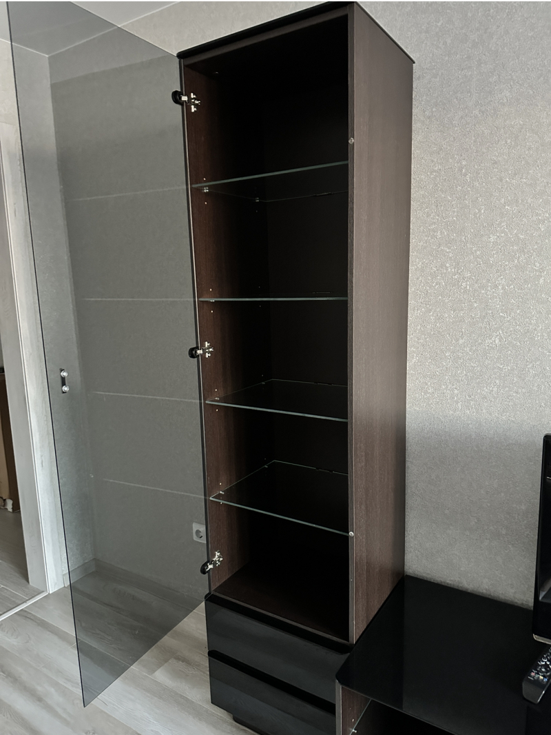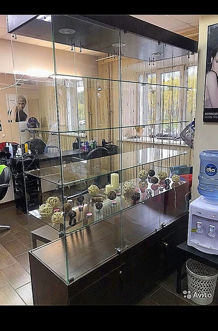 Большая стеклянная витрина. Есть подсветка. Под ключом Высота 225 см, ширина 53см, длинна 152 см.