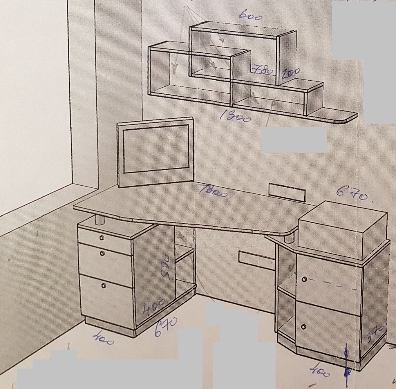 Продаётся надёжный удобный письменный стол (ЛДСП). Изготовливался на заказ. По бокам 2 встроенные тумбы с ящиками (2*4 шт) и один широкий ящик посредине. Внизу в двух местах...