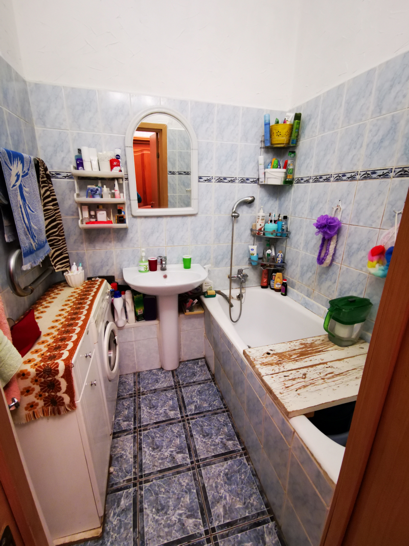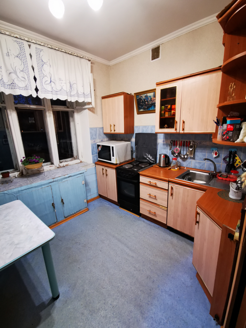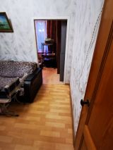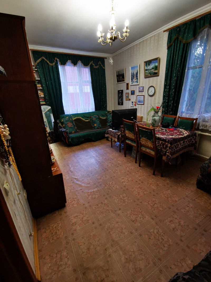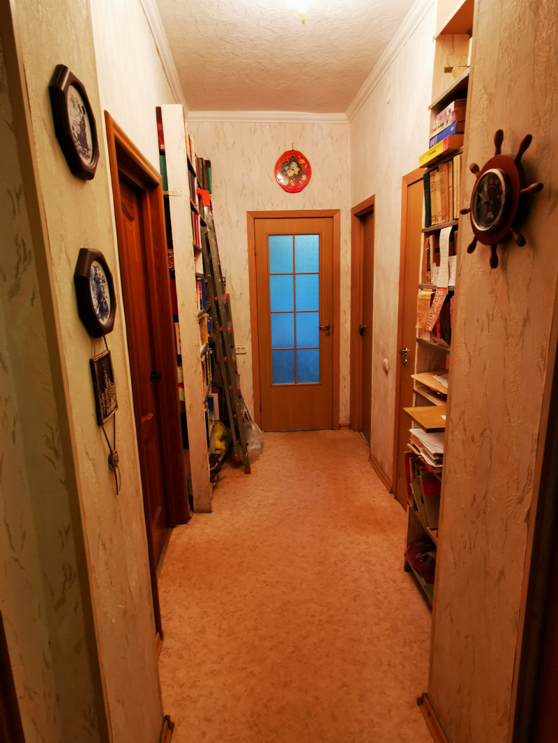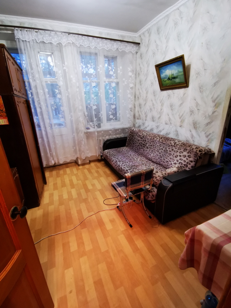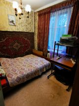 Полногабаритная трёхкомнатная квартира в верхней зоне Академгородка. Угловая, занимает весь торец дома (окна выходят на три стороны), очень светлая, с балконом. Высота потолков 3 м. Все три комнаты изолированные. Одна из больших комнат разделена съёмной деревянной перегородкой с дверным проёмом на 2 смежные комнаты, но возможно разделение на 2 изолированные комнаты, со входами из коридора и из кухни.