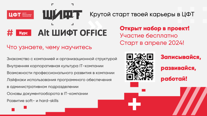 Компания ЦФТ запускает старт регистрации на Alt ШИФТ OFFICE – новый проект для тех, кто только начинает свой профессиональный путь и хочет разобраться, как устроена жизнь крупной ИТ-компании.