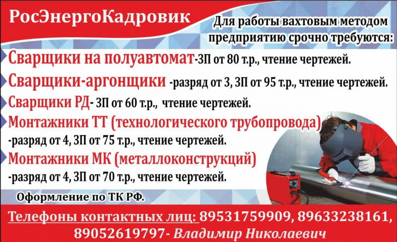 Для работы вахтовым методом предприятию срочно требуются: сварщики-аргонщики (зп от 95 т.р.), сварщики на полуавтомат (зп от 80 т р.), монтажники ТТ (зп от 75 т.р.), монтажники МК (зп от 70 т.р.). Опыт работы от 2лет. Обязательное чтение чертежей. Работа в Ленобласти,в г. Сосновый бор, ЛАЭС, Компания РосЭнергоКадровик. .