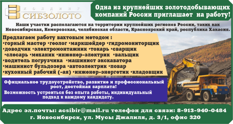 Для работы на месторождениях россыпного золота в Красноярском крае, республике Хакасия, Новосибирской, Кемеровской и Челябинской областях требуются сотрудники!