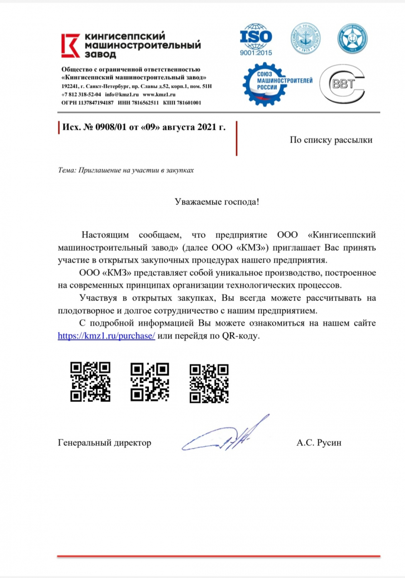 Уважаемые господа! Настоящим сообщаем, что предприятие ООО «Кингисеппский машиностроительный завод» (далее ООО «КМЗ») приглашает Вас принять участие в открытых закупочных процедурах нашего предприятия. ООО «КМЗ» представляет собой уникальное производство, построенное на современных принципах организации технологических процессов. Участвуя в открытых закупках, Вы всегда можете рассчитывать на плодотворное и долгое сотрудничество с нашим предприятием. С подробной информацией Вы можете ознакомиться на нашем сайте https://kmz1.ru/purchase/ или перейдя по QR-коду.