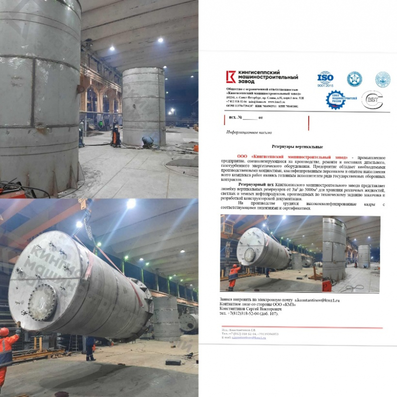 Резервуарный цех Кингисеппского машиностроительного завода представляет линейку вертикальных резервуаров от 3м3 до 5000м3 для хранения различных жидкостей, светлых и темных нефтепродуктов, производимых по техническому заданию заказчика и разработкой конструкторской документации.