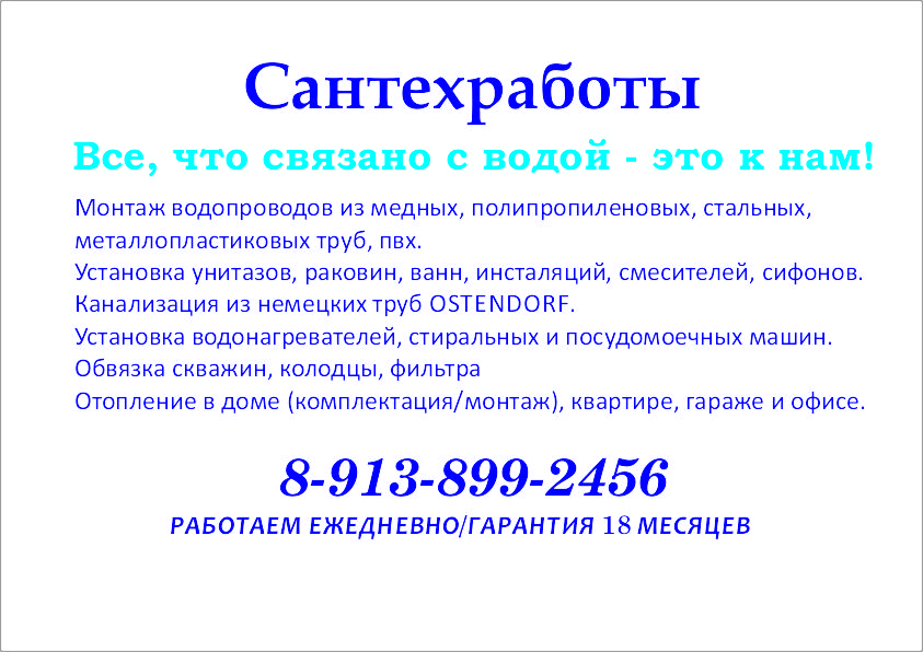 Работаем ежедневно по всем районам города и НСО! Выполняем работы любой сложности, а также предоставляем качественные фитинги. Гарантия.