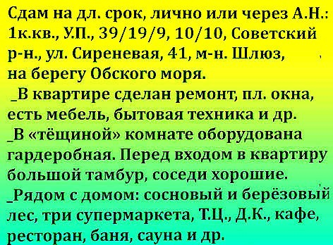 Квартира сдаётся на длительный срок - одному жильцу или семейной паре. Находится в Советском районе на берегу Обского моря, по адресу: Сиреневая, 41. В квартире есть кух. гарнитур, холодильник, ст. машина, э/печь, м/волновка. шкаф для одежды, диван и др.