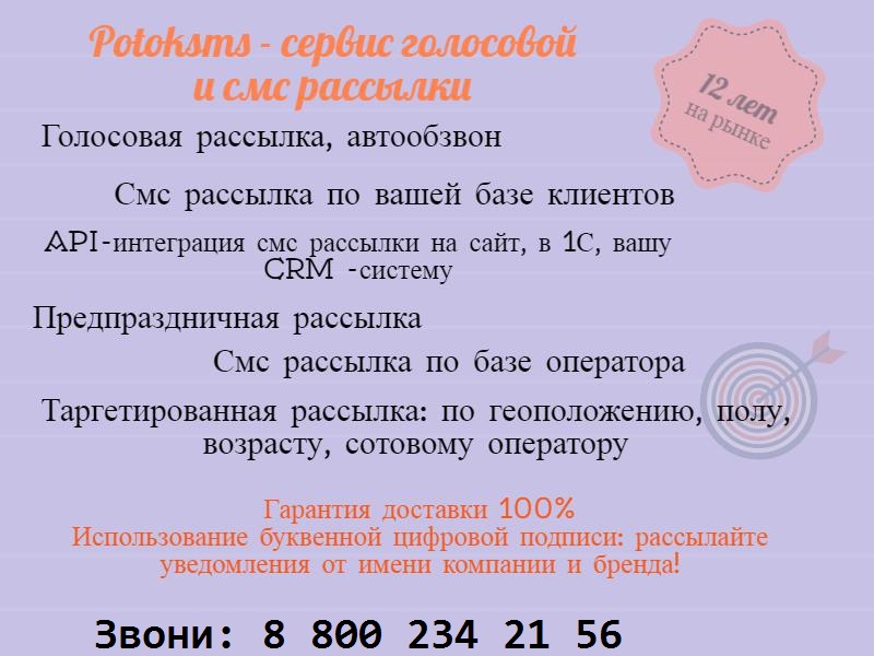 Сервис смс рассылок Potoksms входит в состав смс агрегатора Е-Восток и с 2004 года помогает владельцам бизнеса развиваться и получать прибыль, используя средства мобильного маркетинга. С нами сотрудничают сетевые ритейлеры в разных городах России, используя смс оповещение действующих клиентов, банки выбирают наш смс-сервис для информирования клиентов о денежных операциях, "Единая Россия" выбрала нас для корпоративной рассылки членам партии.