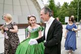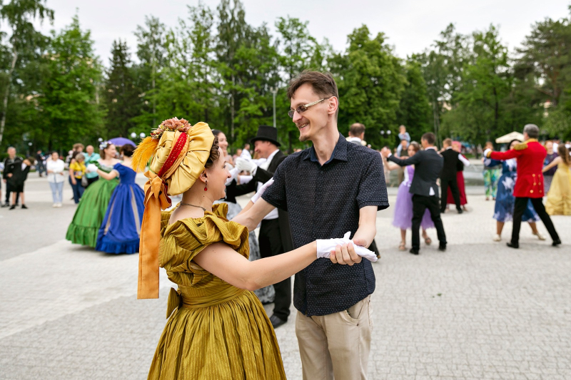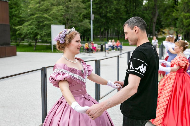 Прямо сейчас формируется состав опытных участников для полонеза - показательного танца-шествия, на сцену Центрального парка. Начинающих и всех желающих поведут костюмированные пары опытных участников под сценой.