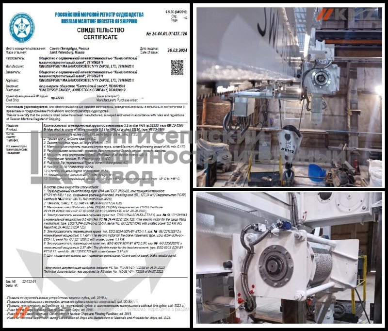 В зависимости от потребностей клиента поставка кранов осуществляется с сертификатом Российского классификационного общества или Российского морского регистра судоходства.