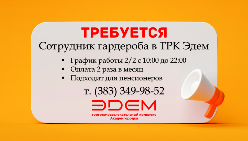 Работа ТРК Эдем, ул. Кутателадзе 4/4. График работы 2/2, с 10:00 до 22:00. Выплаты 2 раза в месяц. Подходит для пенсионеров