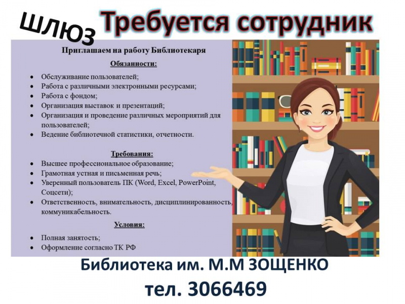 Требуется библиотекарь Шлюз. библ им.М.М Зощенко