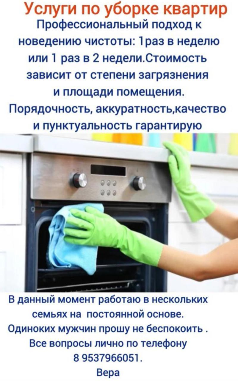 в вашем доме или квартиры. Уборка 1 раз в неделю или 2 раза в неделю, на постоянной основе.О себе : пунктуальная , аккуратность без вредных привычек, В данный момент работаю в нескольких семей , люди довольна моей работой. Цены договорные , и зависят от обьема и загрязнения жилья.Одиноких мужчин прошу не беспокоить !