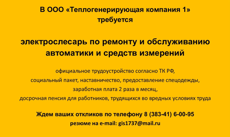 В ООО "ТГК 1" г. Бердск требуетсяэлектрослесарь по ремонту и обслуживанию автоматики и средств измерений