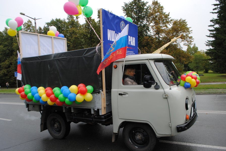 Самой яркой и творческой командой без преувеличения можно назвать коллектив Института цитологии и генетики СО РАН. У них в колонне были и карнавальные костюмы, и плакаты в стиле монстрации, а над всеми возвышалась большая белая мышь из ткани. Сотрудники шли за машиной с надписью ИЦиГ, украшенной шарами. В ней было установлено оборудование, обеспечивавшее музыкальное сопровождение.