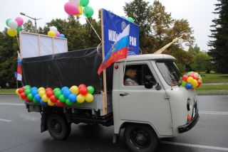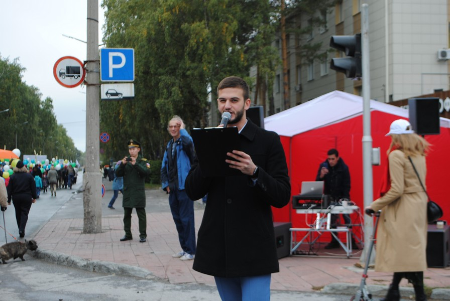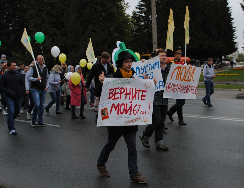 В начале праздничной колонны с народом шагали мэр Анатолий Локоть и председатель СО РАН Валентин Пармон. Они, судя по лицам, и в день рождения не могли отвлечься от рабочих вопросов.