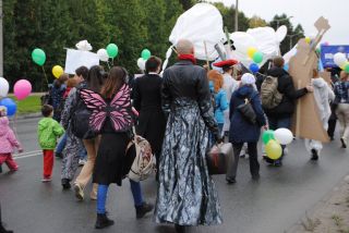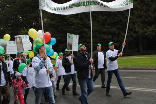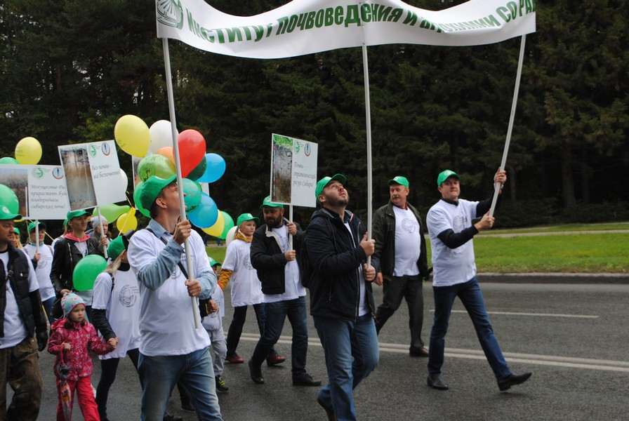 Многие институты СО РАН стали участниками шествия. Сотрудники несли штандарты с названиями научных учреждений, были одеты в кепки и футболки с символикой НИИ, держали в руках зонтики в фирменных цветах, воздушные шары, плакаты. И даже... рабочие инструменты, как, к примеру, Институт почвоведения и агрохимии.
