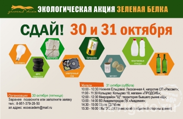 30-31 октября совместно с компанией «РЕТЭКО» при поддержке Общественного фонда «Академгородок» и Молодежного центра «Мир молодежи» проводится акция по сбору вторсырья «Зеленая белка».