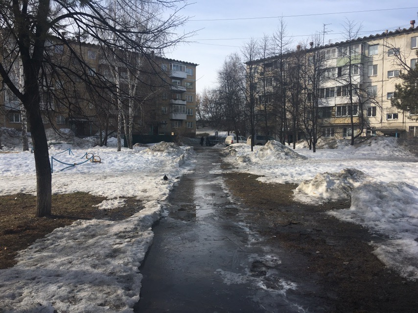 В утренние часы ходить здесь значительно проще: после ночных минусовых температур всё подстывает. Однако как только весеннее солнце прогревает землю, тротуар превращается в полосу препятствий.