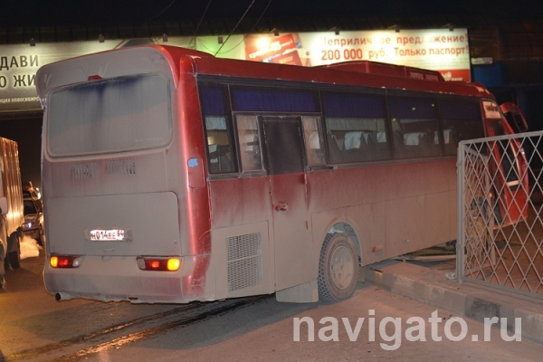 После фура сбила разделительное ограждение и выехала на встречную полосу, где столкнулась с припаркованным автобусом Hyundai Aero Town и опрокинулась на бок. Автобус также откинуло на ограждение.