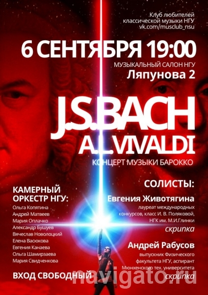 В программе концерта - музыка эпохи барокко: много Баха и немного Вивальди. Классика прозвучит в исполнении Камерного оркестра НГУ и солистов - Андрея Рабусова (скрипка), выпускника физического факультета НГУ, аспиранта Мюнхенского технического университета, и Евгении Животягиной (скрипка), выпускницы Новосибирской государственной консерватории им. М.И. Глинки (класс И.В. Поляковой).