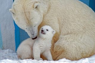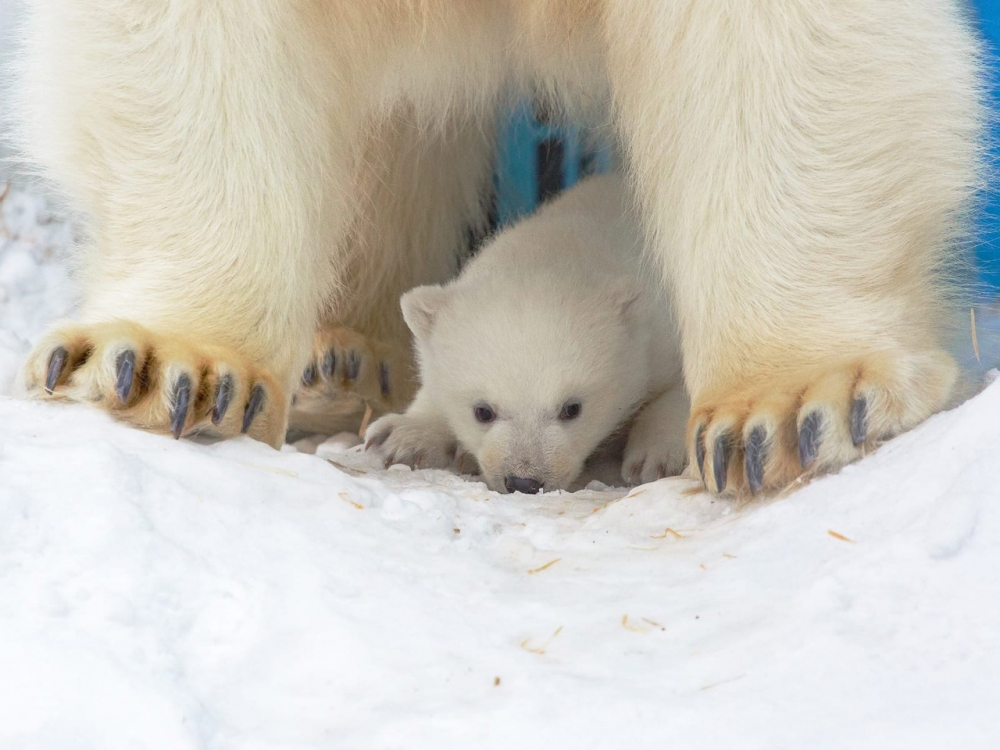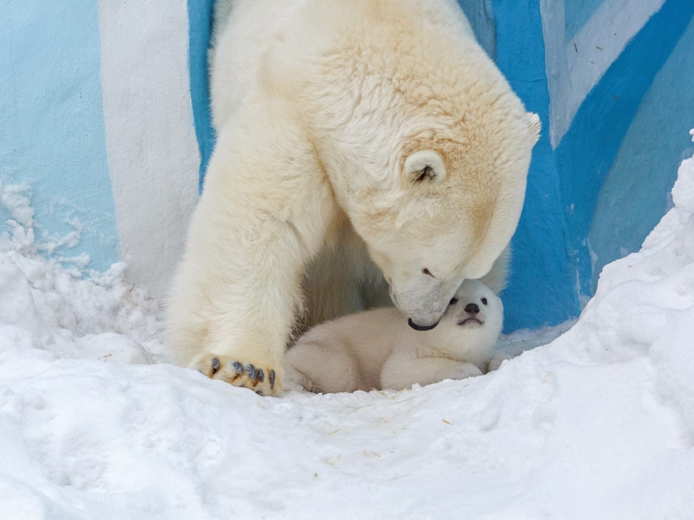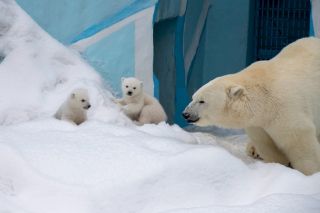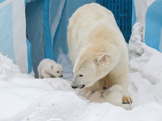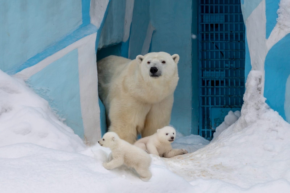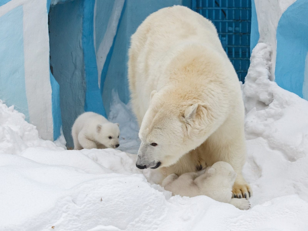 Белая медведица Герда стала выводить медвежат на прогулки