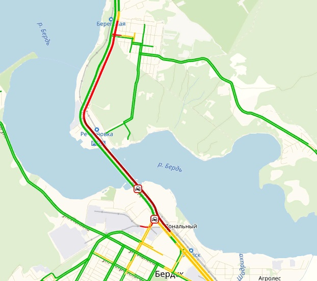 Согласно сервису Яндекс.Пробки, сейчас скорость движения транспорта по Бердскому шоссе (от выезда из Бердска и практически до жилого района Кирово) составляет не более 5 километров в час.