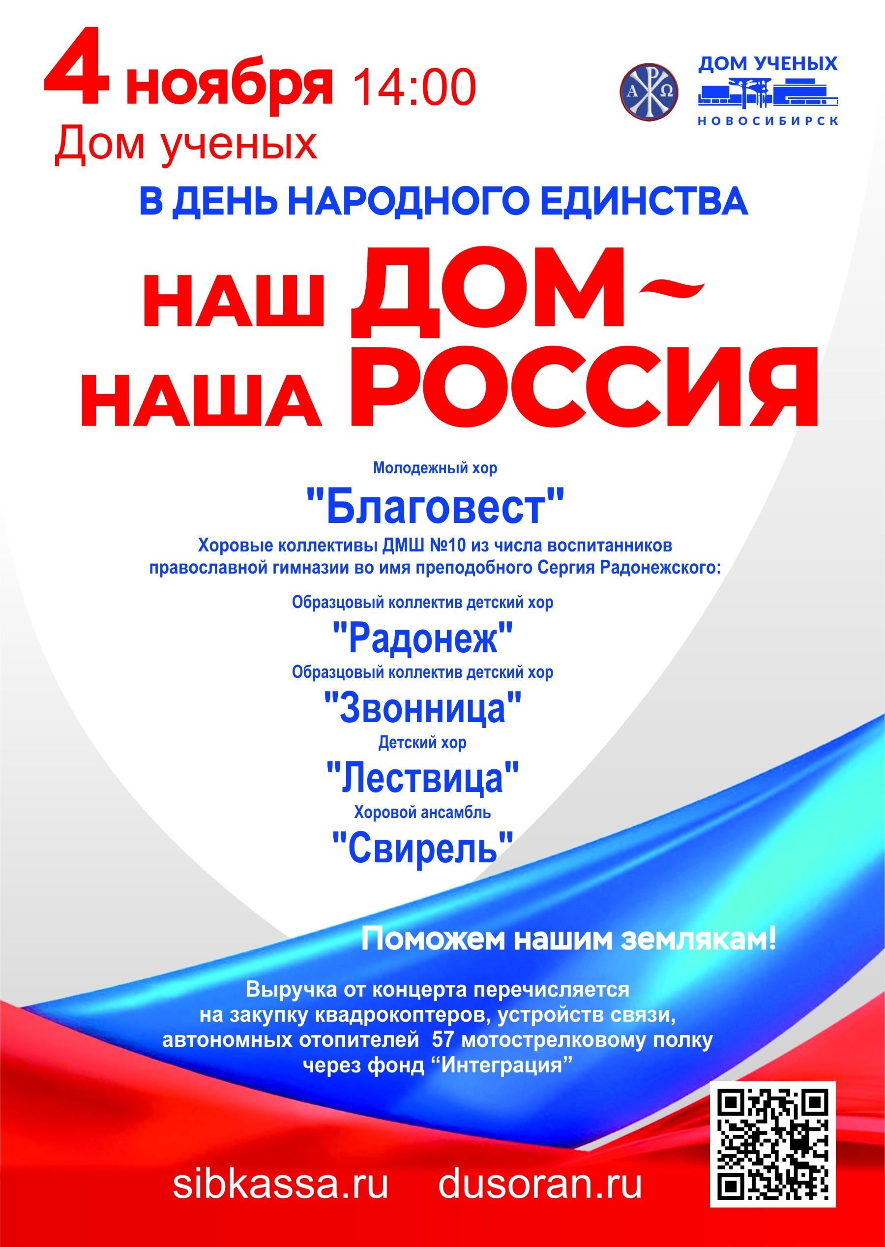 Новосибирский Дом учёных в День народного единства проводит традиционный благотворительный концерт «Наш Дом – наша Россия». Вырученные от продажи билетов средства направят на приобретение спецсредств для СВО.