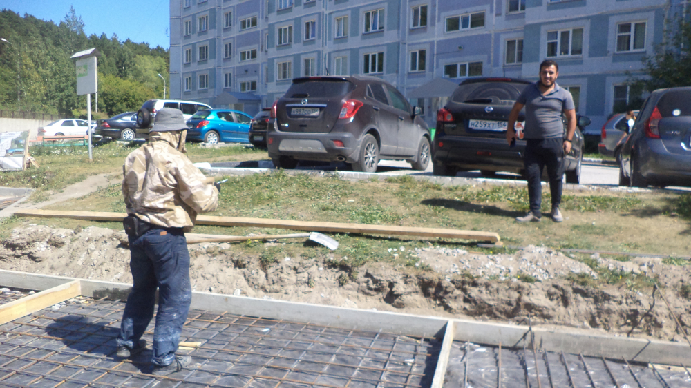 В итоге возле одного из домов обнаружилась бригада в составе трёх уроженцев Таджикистана, которая, несмотря на обеденное время и солнцепёк, вручную собирала кладочную сетку из длинной арматуры большого диаметра. Трудившиеся робко предположили, что работа движется медленно из-за нехватки людей.